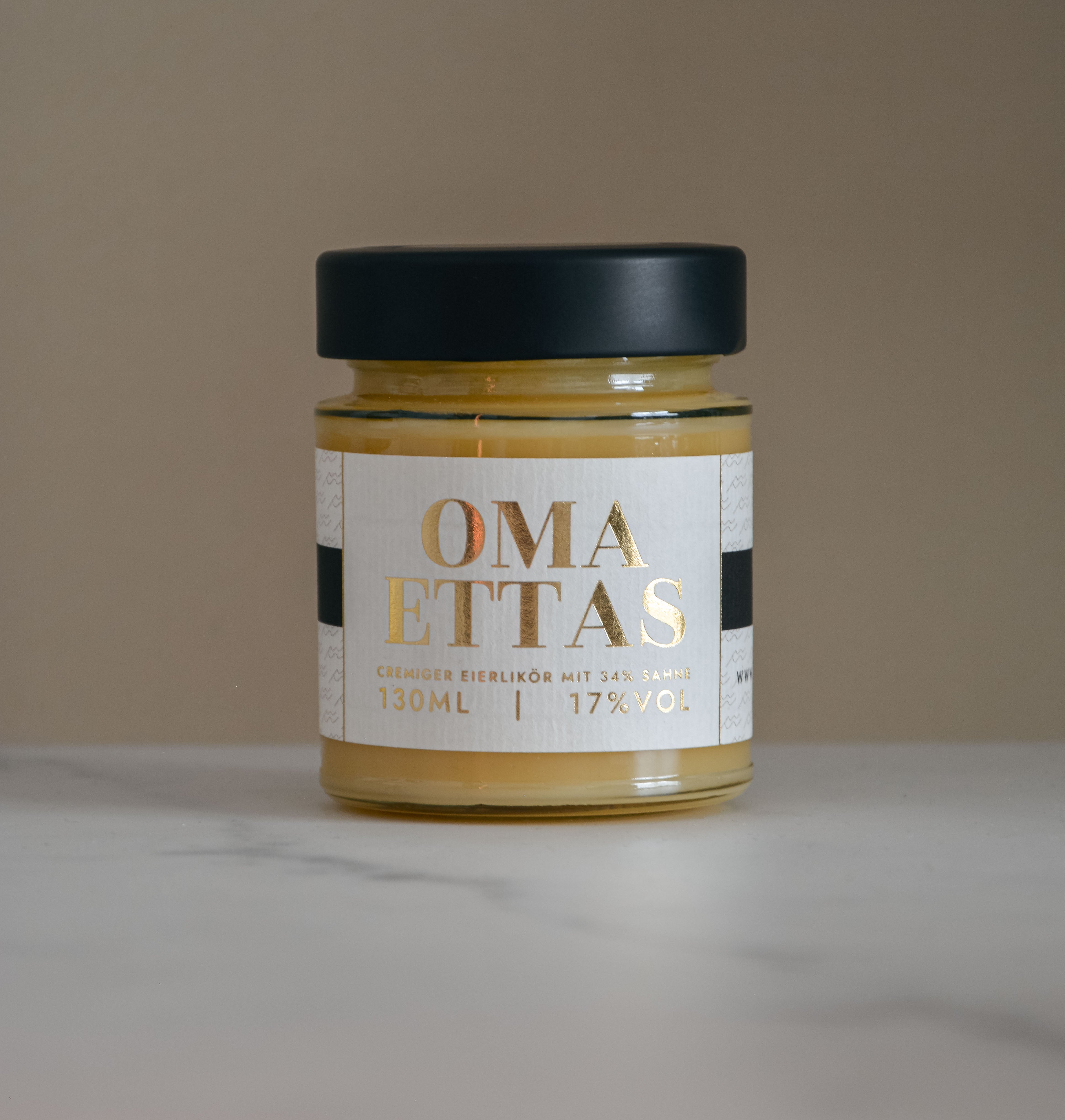 Unser Klassiker - Oma Ettas einzigartig cremiger Eierlikör mit 34% Sahneanteil und 17% vol in unserem neuen Oma Ettas Glas.