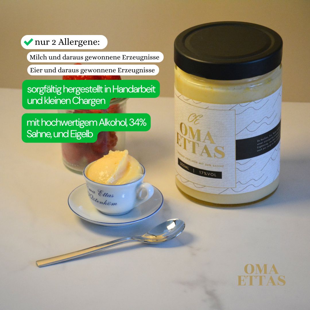In Oma Ettas sind nur einige wenige Zutaten enthalten, darunter Sahne, Eigelb und Alkohol. Aber das Rezept können wir natürlich nicht komplett preisgeben. :)